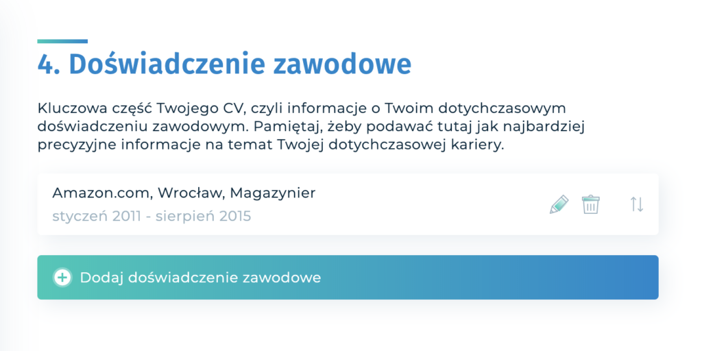 Tak prezentuje się sekcja pozwalająca na zarządzenie doświadczeniem zawodowym w naszym Kreatorze CV.